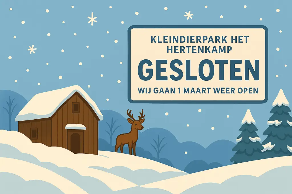 Bij Kleindierpark het Hertenkamp zijn we seizoensgebonden geopend. Inmiddels is het alweer erg nat en niet fijn om door het park te lopen. En daarom zijn wij vanaf heden tot 1 maart 2026 gesloten voor publiek.